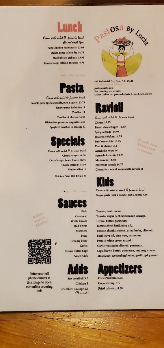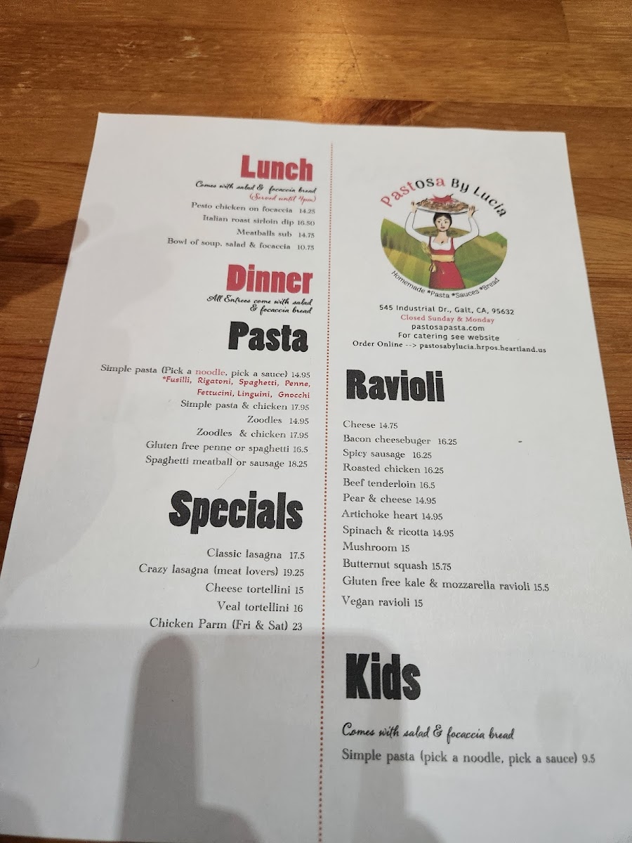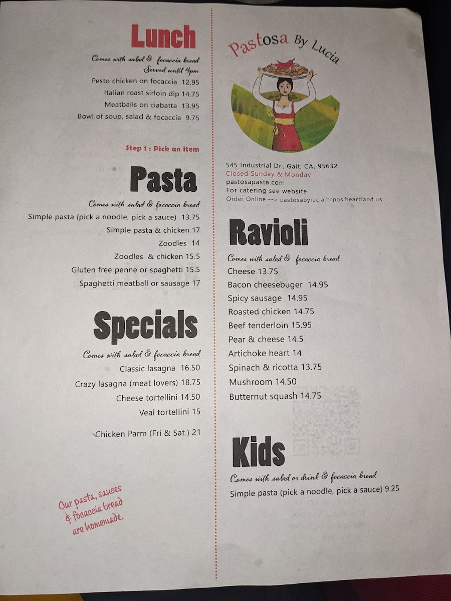 The menu at Pastosa By Lucia features a variety of Southern Italian dishes, with a strong emphasis on handmade pastas and traditional preparations. It is organized into several sections that include ravioli with diverse fillings ranging from classic cheese and spinach & ricotta to options like spicy sausage, bacon cheeseburger, and vegan varieties. Other pasta selections include lasagnas, tortellini, gnocchi, and penne with different sauces such as meat sauce, white cream sauce, and pesto.