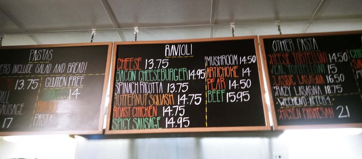 The menu includes options catering to different dietary preferences, including gluten-free and vegan ravioli choices. Kids’ meals feature simple pasta dishes with smaller portions.